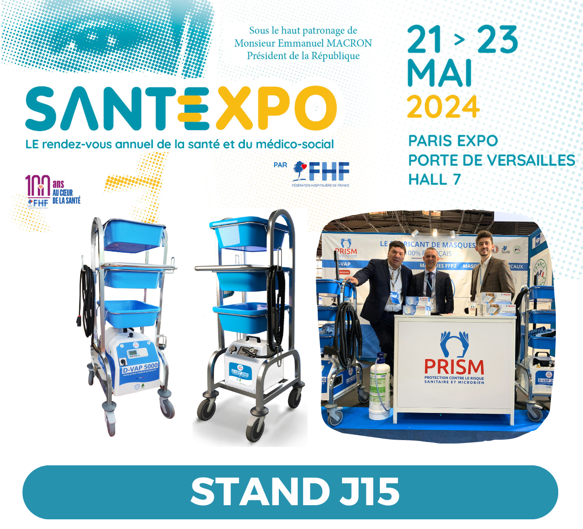 Du mardi 21 au jeudi 23 mai 2024, PRISM participe au salon SANTEXPO Paris. Le rendez-vous annuel de la santé et du médico-social. Venez nous rencontrer et découvrez sur place nos solutions de nettoyage et désinfection vapeur.